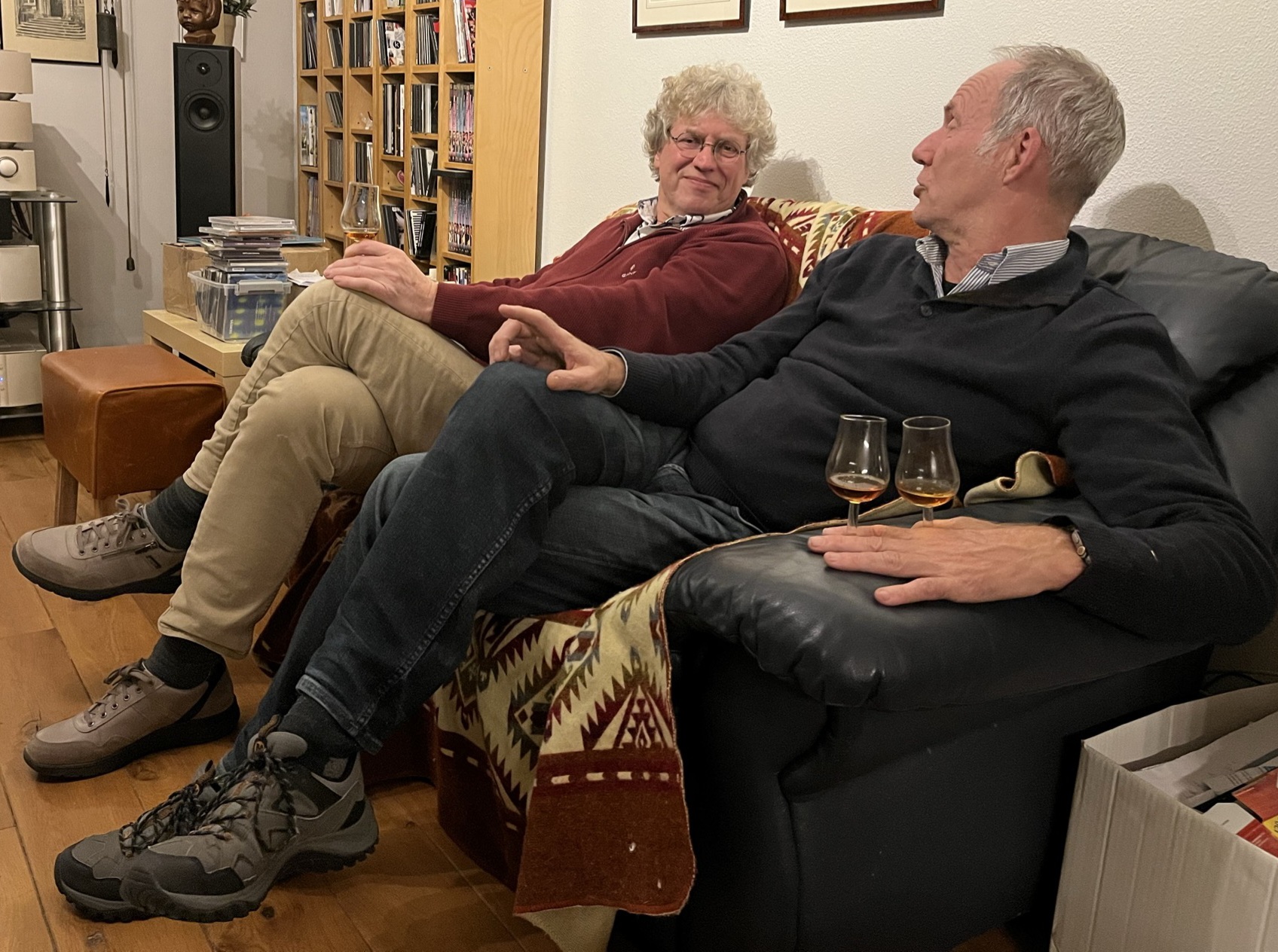De vraag aan de groep is uiteraard welke vatrijping de voorkeur heeft. De meerderheid stemt voor het Sherryvat. Alleen Nico en Alexander gaan vol overtuiging voor het bourbon vat en gaan zelfs een fles kopen indien nog mogelijk. De voorlopige score bij Nico is 89 voor de Bourbon en 86 voor de Sherry. Alexander noteert 90.3 en 87.4. Proefnotities helemaal vergeten te maken tijdens de discussie.
