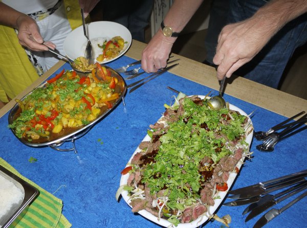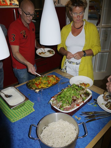 Dat lieten wij ons geen 2 maal zeggen schepten deze heerlijke gerechten op onze borden. De 2 hoofdgerechten waren kip met verse mediterraan fruit in zoetzure saus en ossenhaas suki yaki a la Andre van der Zwet.