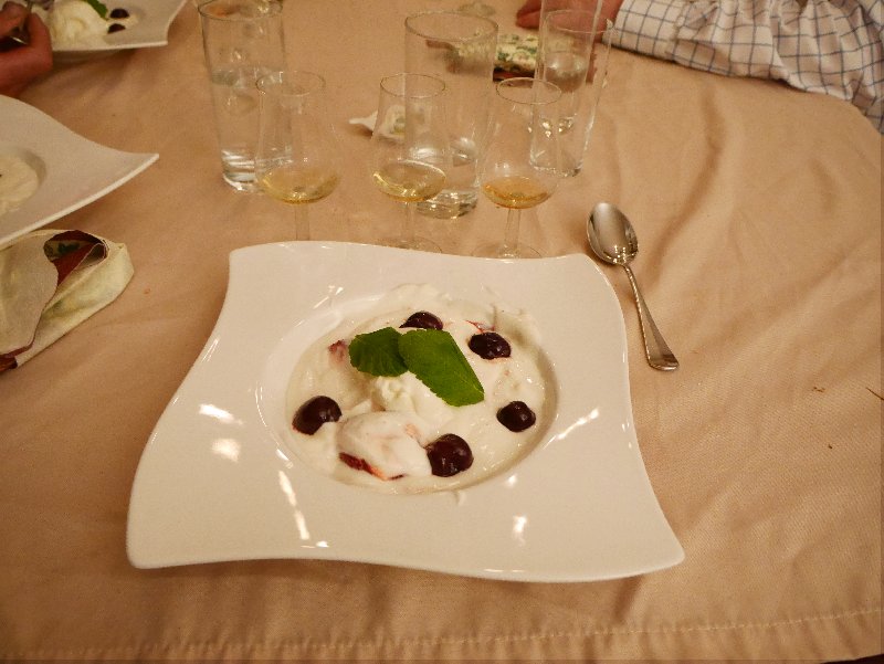 Hiermee waren we door de Springbank bottelingen heen en gingen we verder met 2 stuks Glen Scotia's te weten de • Glen Scotia 18Y, 52.6%, Kintra, 02/1992 - 11/2010, Sherry hogshead cask nr. 414, en de • Glen Scotia 15Y, 62.1%, The Glydesdale, May 1991-Sep. 2006 Deze Glen Scotia’s maakten geen geweldige indruk; Kintra was een zwavelig sherryvat en The Clydesdale messcherp met zijn 62% Verdunnen maakte deze whisky wel een stuk toegankelijker, maar het niveau van Springbank wordt niet gehaald. Hierna serveerde Nico nog een nagerecht van vanille roomijs met een kwark van witte chocolade en witte perzik, gegarneerd met wat aardbeien en muntblaadjes. Heerlijk na die heftige Glen Scotia’s