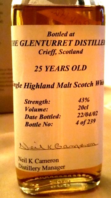 Glenturret 25Y, 43%, bottled 22-04-2002 in 20cl bottle by Distillery manager Neil Cameron, bottle 4 of 239.