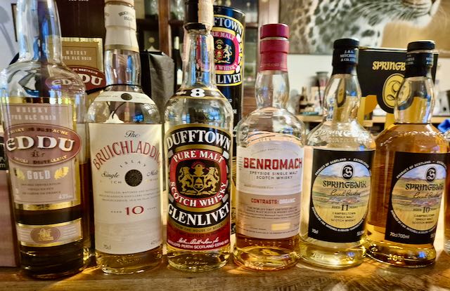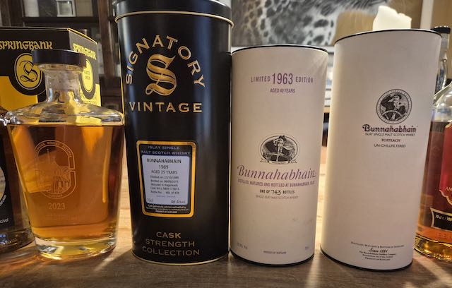 Het volgende rijtje flessen wordt klaargezet in afwachting van de maaltijdbezorger. Een relatief onbekende Lowland whisky en maar liefst 3 Bunnahabhain edities waarvan we er 2 kennen en vol verwachting zijn.