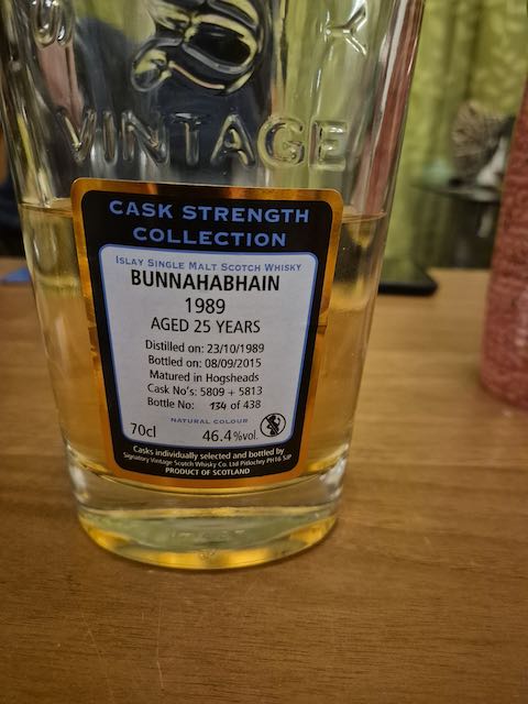 We gaan door met Bunnahabhain 1989, 25Y, 46,4%, distilled 23-10-1989, bottled 08-09-2015, hogsheads No. 5809+5813, Signatory Vintage, 438 bottles (#134 geproefd)