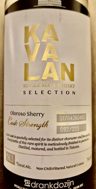 15. Kavalan Solist ex-Oloroso Single Cask Strength Single Malt Whisky, 56.3%, Cask no. S170426040C, bottle 092/223, Specially selected and bottled for The Netherlands, Edition 2023 Drankdozijn