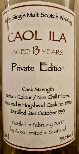 22. Caol Ila 13Y, 59.1%, Private botteling, Hogshead cask # 15510, Distilled 21-10-1993 and bottled Feb. 2007 by Aceo Ltd. In Scotland. Non chill filtered and natural coloured (83)