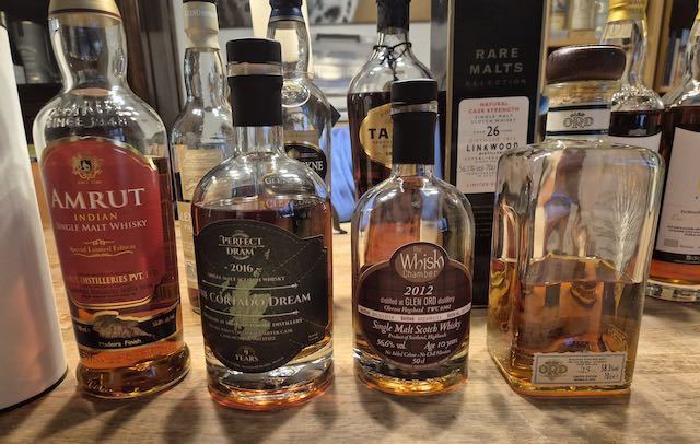 Met de Amrut zijn we aan de derde rij flessen begonnen. Nico heeft een whisky gerijpt op Palo Cortado sherry meegenomen; tevens is het zijn eerste aankoop via Perfect Dram die vaten kopen waar je tenminste 2 flessen uit af kan nemen. Met hun fraaie etiketten is alvast niet mis. Zie voor meer informatie en de lijst beschikbare vaten www.perfectdram.nl