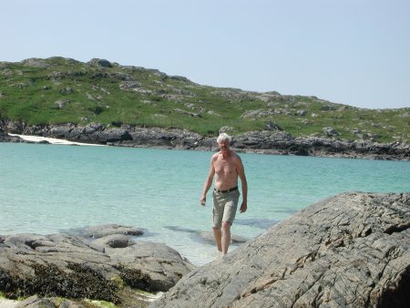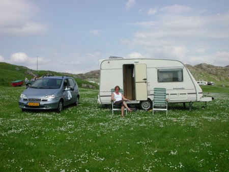 Uitgeslapen zijn we vandaag naar het naastgelegen zandstrand gegaan. De zon liet zich goed zien tegen een stralend blauwe hemel. De water temperatuur was kil maar niet vreselijk koud. Toch door de koude zeewind, na een tijdje, terug naar de caravan waar het heel wat warmer was. Even maar, want we hebben ook de rotsige kustlijn voor ons verder onderzocht. Daarna zijn we naar het nabijgelegen havenplaatsje Lochinver gereden om verse vis (dachten we) en anti midges spul in te kopen. Helaas, geen viswinkel bij de vissershaven of elders in dat plaatsje aanwezig. De lokale slager verkoopt op maandag ook wel eens vis. Het aantal inwoners en de animo voor verse vis is hier kennelijk niet erg groot.